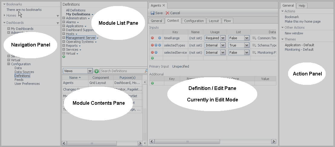 In Foglight, you access these panes from Dashboards > Configuration > Definitions in the navigation panel.