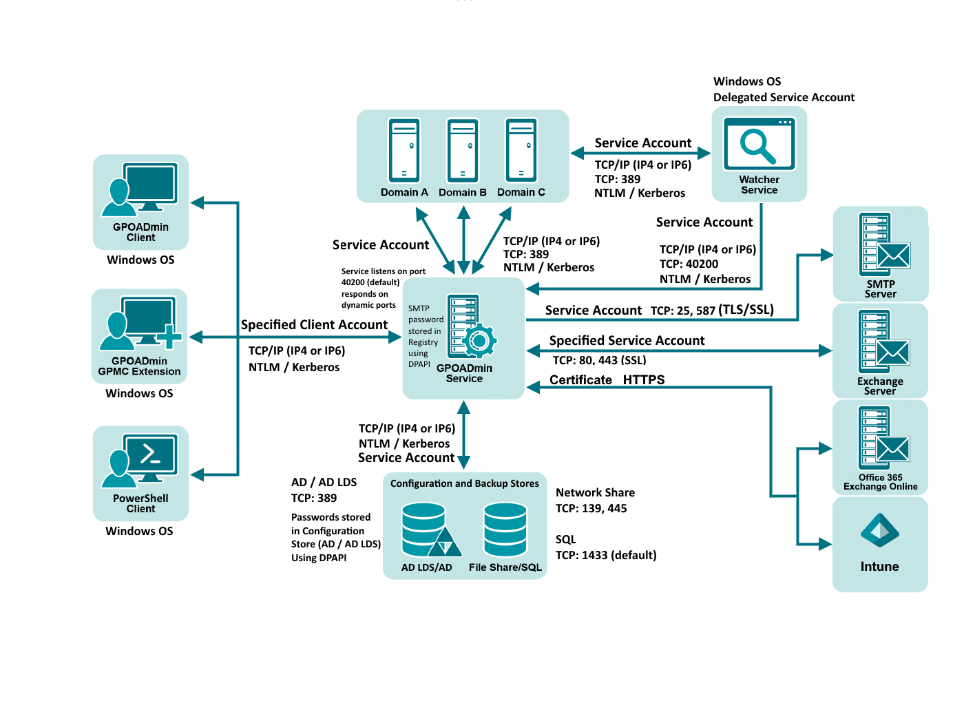 The following diagram provides an overview of the interactions and communication protocols between service accounts, client accounts, and servers within a Windows OS environment.