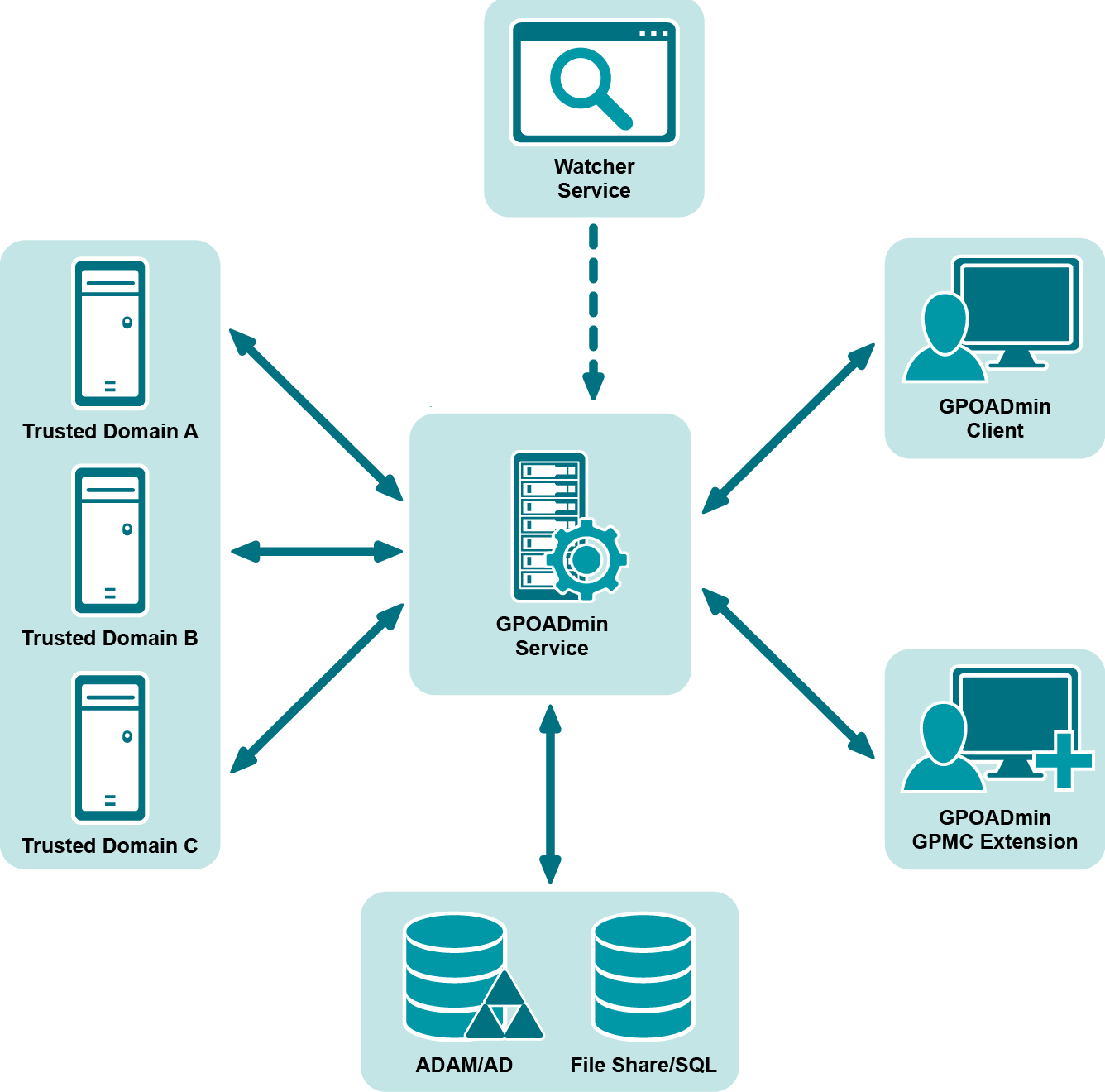 The following diagram illustrates the architecture and communication flow of a system involving the GPOADmin Service. The main components include: