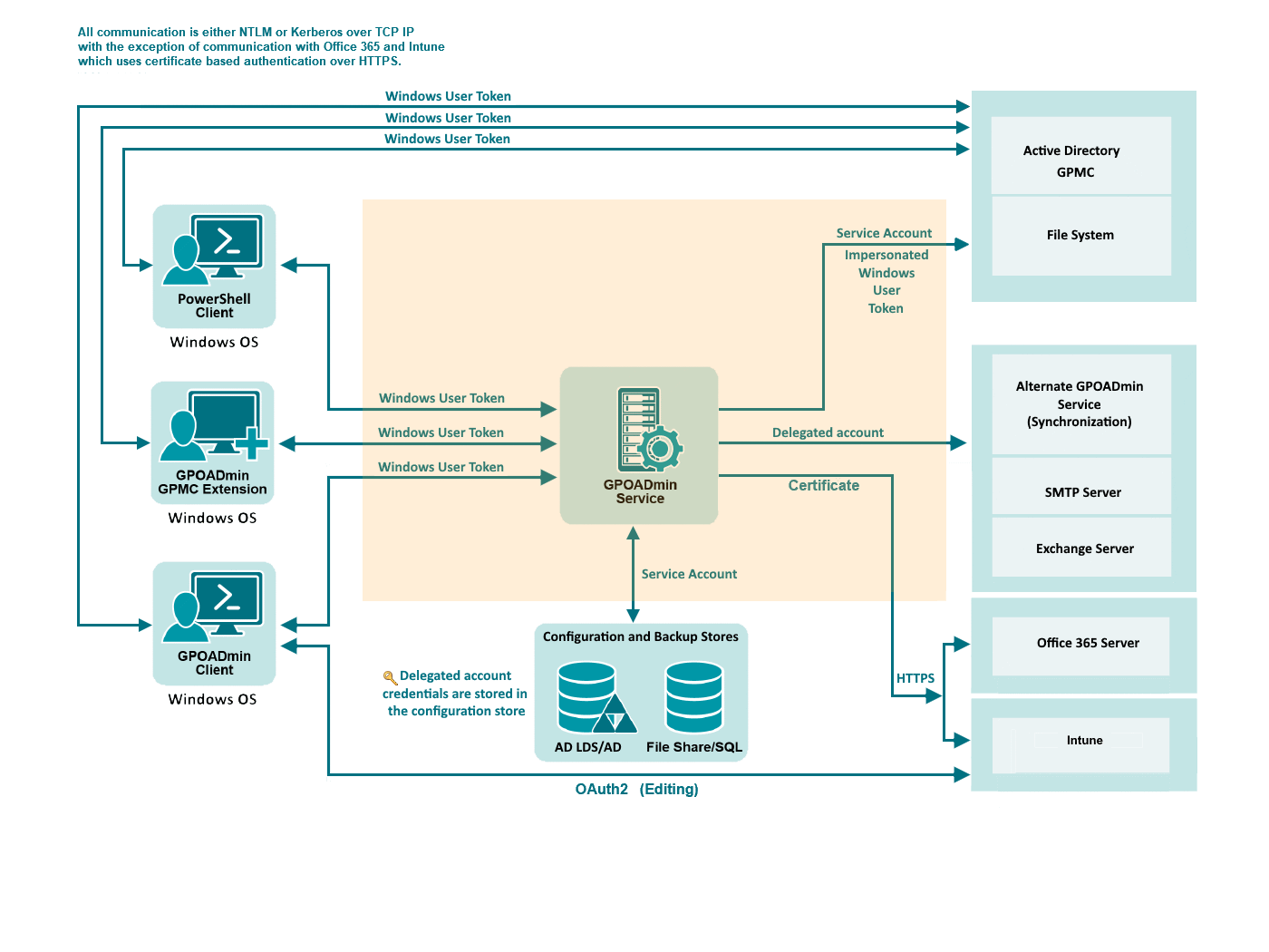 The diagram shows how different clients communicate with the GPOADmin Service using Windows User Tokens or Delegated Accounts. The service uses certificates for secure communication over HTTPS.