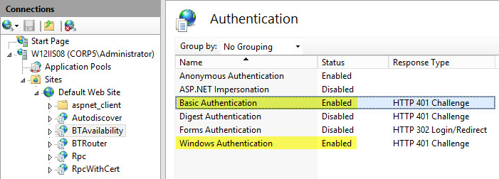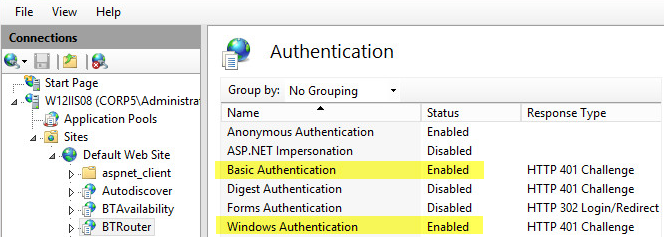 1. Be sure that Basic Authentication and Windows Authentication are enabled; if they are not, enable them: