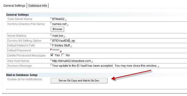 1. Configure the database; see the Configuration of the Domino Database section below for more information; use the IBM IDVault database as the preferred configuration