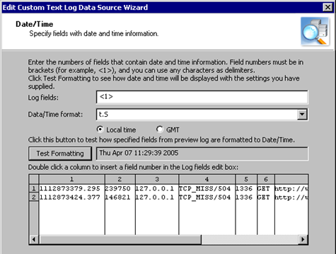 In this example, you will create a working data source that handles gathering of the Squid proxy server’s access log. The Squid access log can have three formats. This example uses the access log native format which is the default format.
