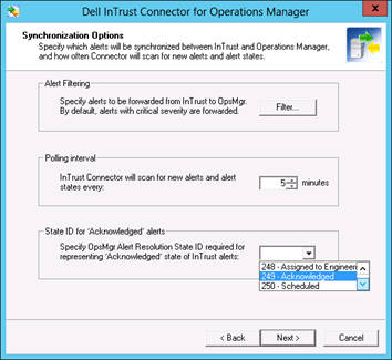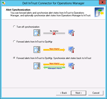 • Select Forward alerts from InTrust to OpsMgr. Synchronize alert states back to InTrust to receive the alert state back into InTrust.