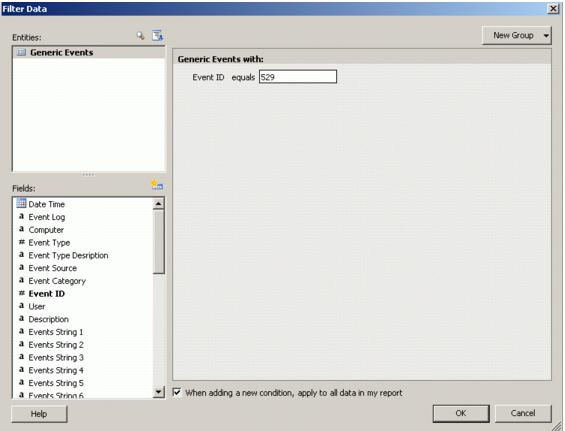 5. To report on failed logon events (Event ID 529), set the filter equal to 529 by entering this number in the edit box.