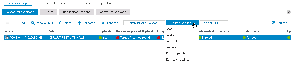The Update Service is used by the USB/Port Security and Software Management objects. To configure the Update service in the Server Manager grid, first select the server that will be updated. Next click on the Update Service drop menu and then choose the selected action from the menu. The Update Service can also be managed by right-clicking on the server and choosing Update Service.