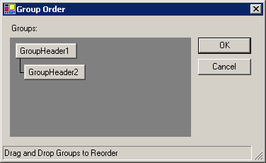 When one or more Group Header/Footer sections are part of a report the groups may be reordered after they have been added to the report. Right-click on any header or any empty area of a section and select Reorder from the shortcut menu. The Group Order dialog will be displayed.