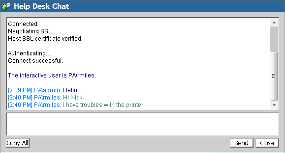 2. Once typed, click Send button or hit Enter. The text typed by both yourself and the remote user appears in the upper pane of the chat window.