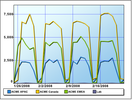In the first three examples, the selected data source is Servers - Server Activity Totals. In the fourth example, the data source is Storage - Exchange Database Summary.