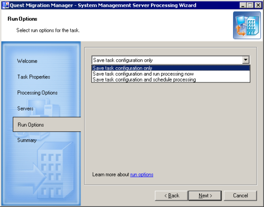 • Save task configuration only—Select this option to save the task configuration. You can start the task any time later by right-clicking it in Migration Manager and selecting Start from the shortcut menu.