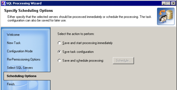 To reconfigure the task, right-click the task object and select Properties. The SQL Processing Wizard will start and let you specify different options for the task. Refer to the steps above for more information on the options.