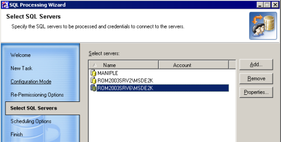 Use the Remove button to remove servers from the list. To change the credentials for a server, select the server in the list and click the Properties… button. Specify the new credentials in the SQL Server Properties dialog box.