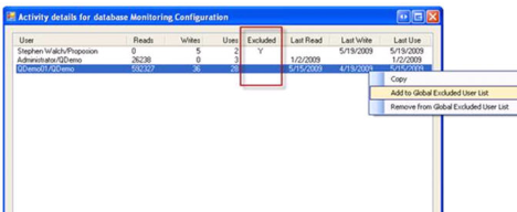 Details by user button gives you the number of reads, writes and uses as well as the last read, last write and last used dates by user. It also displays if the user is part of the Excluded User Names list. A user can be added or removed from the Global Excluded User Names List using the context menu once the row for the user has been highlighted. This type of change does require the Data Scan to be re-run it to be picked up in the details.