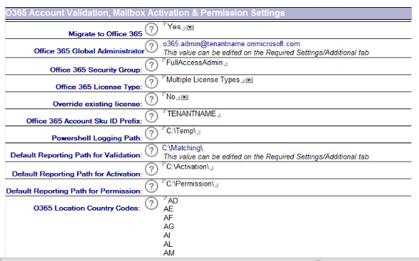 Specify the ISO Country Codes that will be assigned to the account in Office 365. These values will be used during the activation process.