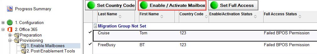 3. Once the Country Code is set, select one or more entries and then click the Enable/ Activate Mailbox button to enable a Mailbox; enter your password in the Begin Activation of Office 365 Users command line window: