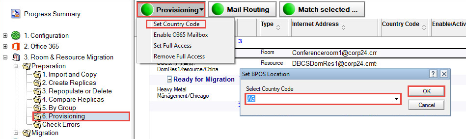 Select one or more entries and then click the Provisioning button and choose Set Country Code from the dropdown menu. Select a country code from the dropdown list in the Set BPOS Location window and click OK. This will add a value to the Country Code column for the selected items: