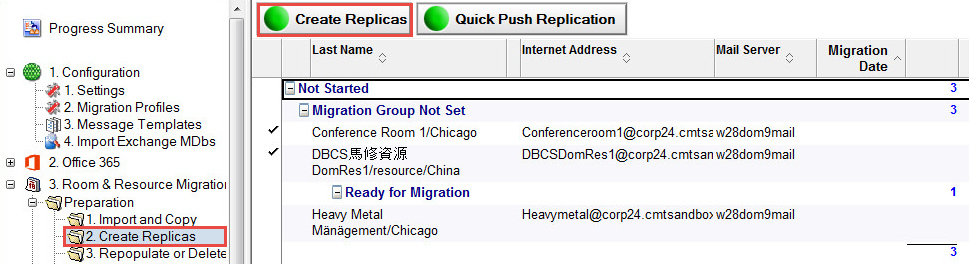 Click Yes to confirm setting the migration group. Notice that the selected rooms and resources are now listed under the newly created group: