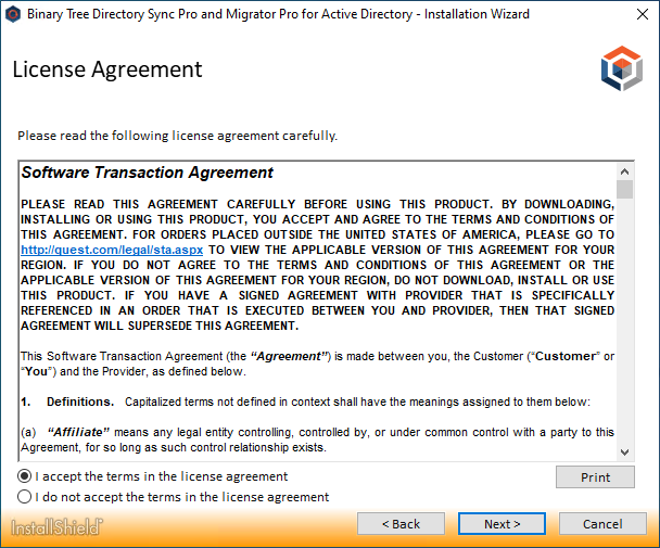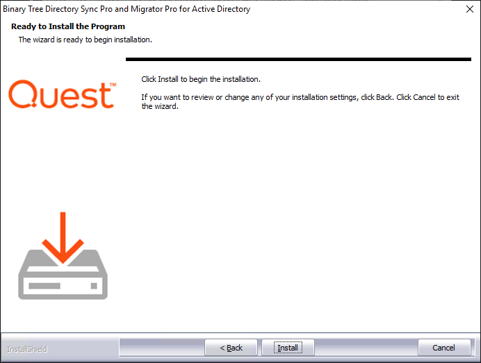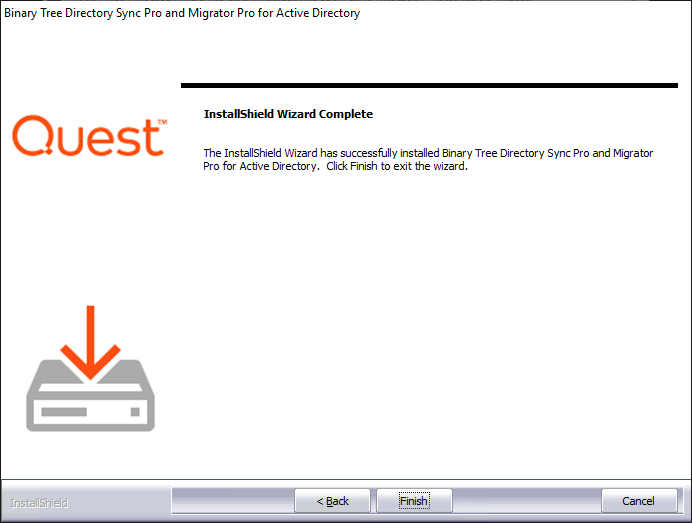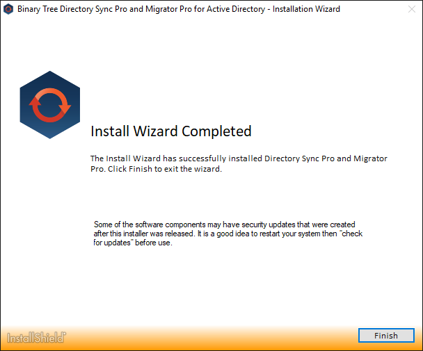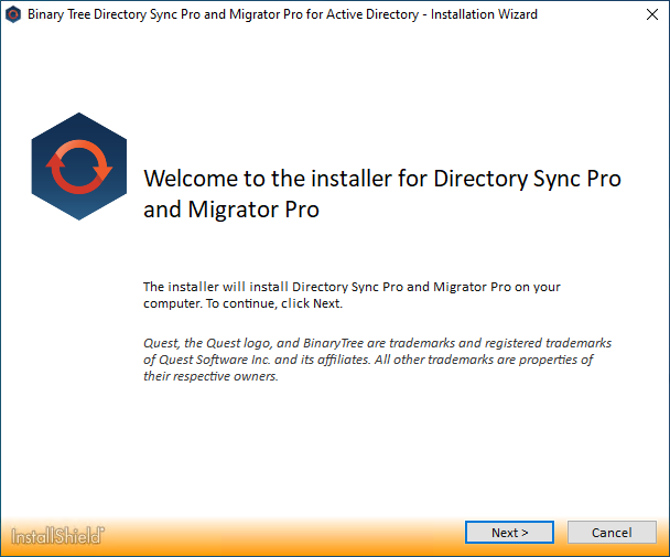 The Binary Tree Directory Sync Pro for Active Directory and Migrator Pro for Active Directory installer can be used to install both Directory Sync Pro for Active Directory and Migrator Pro for Active Directory at the same time or individually. Migrator Pro for Active Directory should only be installed at the same time as Directory Sync Pro for Active Directory or if it has previously been installed on the same server.