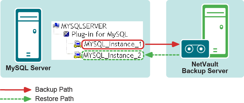 La nouvelle instance cible doit être configurée correctement dans Plug‑in for MySQL : le processus décrit dans Configuration du plug-in doit avoir été exécuté correctement pour ajouter la nouvelle instance MySQL, c’est-à-dire que l’instance cible doit être révélée et accessible dans le nœud Plug‑in for MySQL de la page Sélections NetVault Backup.