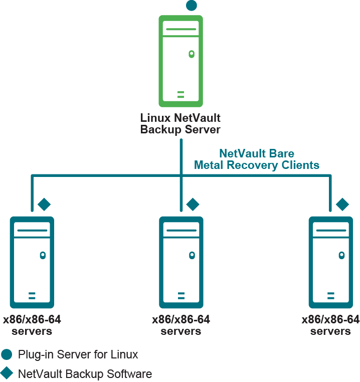 适用于 Linux 的 Plug-in Server 组件安装在 Linux NetVault Backup Server 上,Plug-in Offline Client 用于执行 Intel x86 客户端的备份和恢复。
