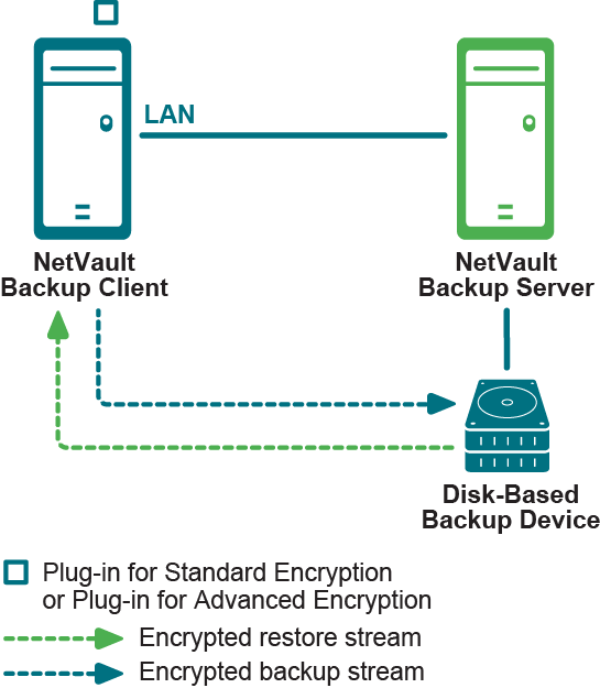 NetVault Backup performs software-based encryption. The backup stream is encrypted using the selected algorithm by the NetVault Backup Server or Client where the plug-in is installed. The encrypted data stream is transferred over the network to the backup device where it remains encrypted. During restore, the encrypted backup is transferred from the backup device to the targeted NetVault Backup Client, where the plug-in installed on the client completes the decryption.