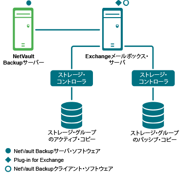 あるCCRシステム構築では、プラグインはExchange仮想サーバーにインストールされています。Exchange仮想サーバーは、クラスタを構成するノードとホストのグループです。NetVault BackupServerはクラスタを仮想クライアントと呼ばれる単一クライアントとみなします。仮想サーバーにPlug‑in for Exchangeをインストールする場合、プラグインはNetVault Backupのクラスタ・サポートを使用してすべてのノードにインストールされます。NetVault Backupの仮想クライアントはExchange Virtual Serverのアクティブまたはパッシブ・ノードのいずれかのバックアップに使用されます。