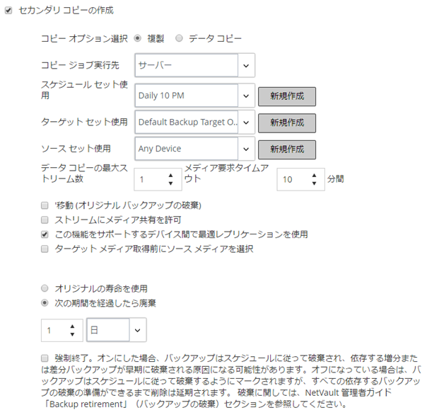 [セカンダリ・コピーの作成]チェック・ボックスをクリックして、以下の項目を設定します。