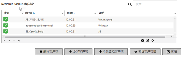 管理客户端页面上,您可以查看添加到服务器的所有 NetVault Backup 客户端。该页面还显示虚拟客户端。