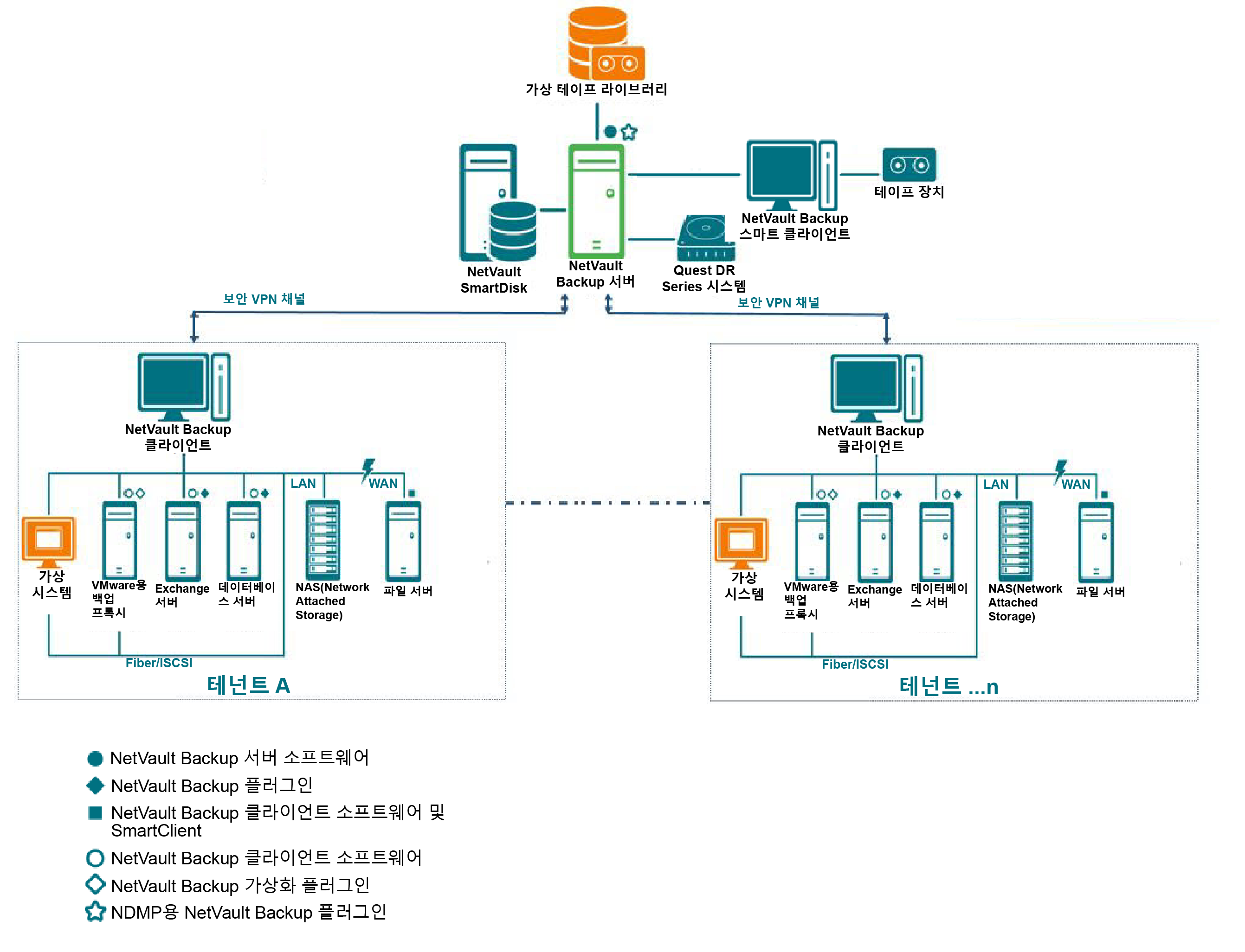NetVault Backup 서버는 테넌트 데이터 보호를 위한 핵심 서비스를 제공합니다.