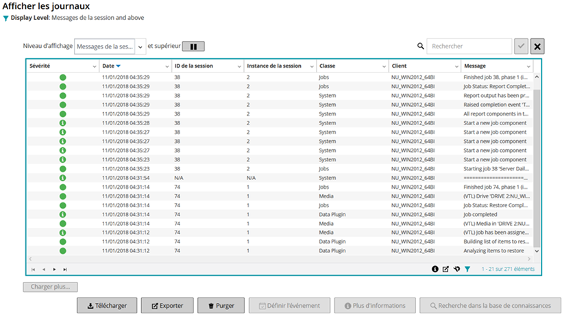 Tous les processus de NetVault Backup génèrent des messages de journal afin de fournir des informations sur le statut de diverses opérations et de signaler des conditions d'erreur. Ces messages sont stockés dans la base de données NetVault. Vous pouvez consulter les messages du journal dans la page Afficher les journaux.