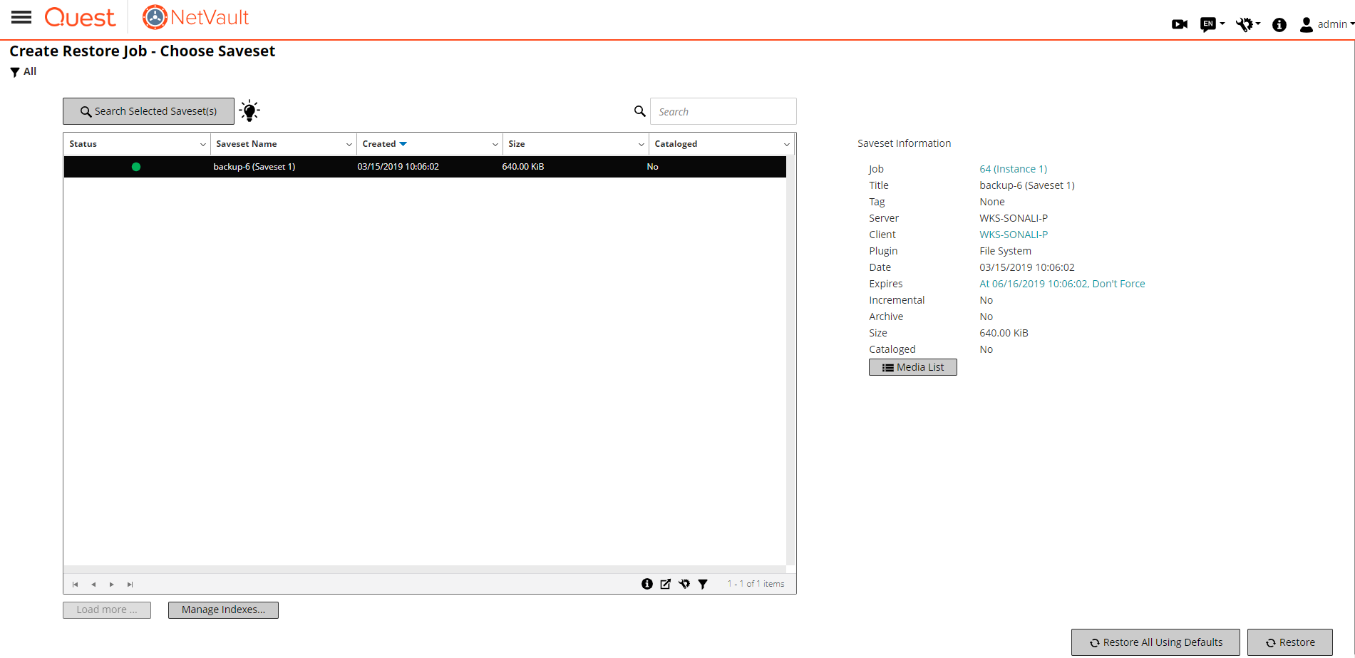 Restore All Using Defaults. This option selects the entire saveset and pre-populates the details on the Create Restore Job page. It then navigates you to the Create Restore Job page where you can optionally change the details by using the buttons beside each text box. The job name appears in the following format: Restore_Saveset savesetid_system date and time _jobid+1. Optionally, you can change the job name. For more information about changing the restore details, continue to the next step. To restore using the pre-populated defaults, skip to Step 11.