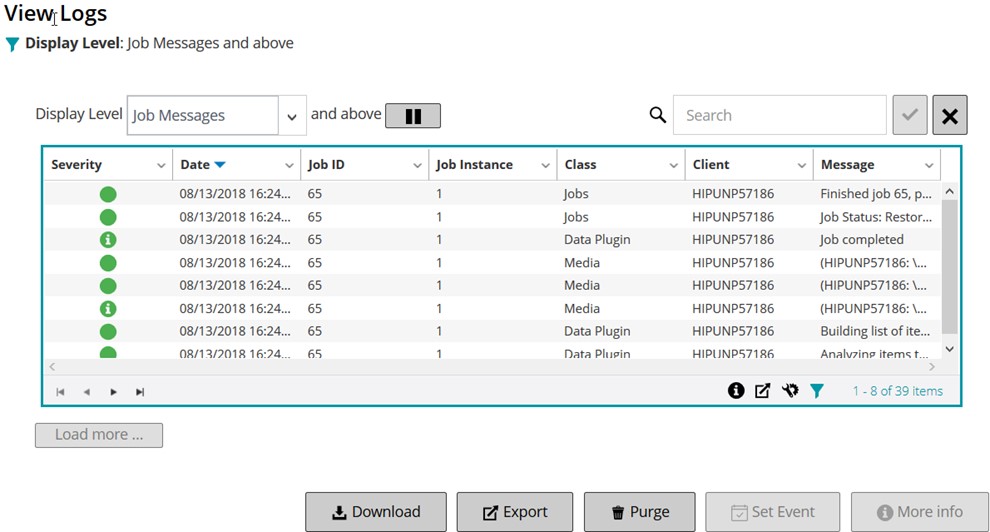 Protokollmeldungen werden in die folgenden Schweregrade unterteilt: Hintergrund Meldungen, Informationsmeldungen, Job-Meldungen, Warnmeldungen, Fehlermeldungen und schwerwiegende Fehlermeldungen.