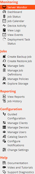 Backing up data Managing policies Restoring data Managing NetVault dashboard Managing jobs Monitoring logs Managing storage devices