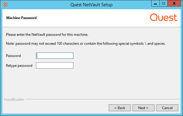The machine password is used while adding a NetVault Client to the server. The password can contain a maximum of 100 characters. It cannot contain the following characters: