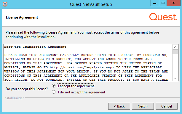 In the License Agreement dialog box, select the I accept the agreement option if you accept all the terms.