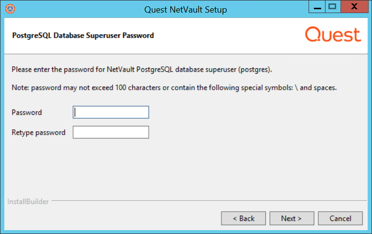 For more information about specifying a password for the PostgreSQL database super user, see Determine NetVault name and password.