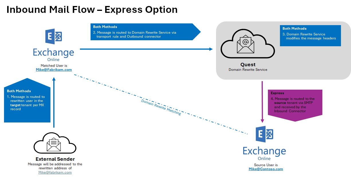 - The Quest Rewrite Service signs the message and securely (via the certificate uploaded during project setup) sends to the Target Tenant using the Inbound Connector