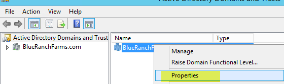 2. In Active Directory Domain and Trusts, right click and choose Properties.