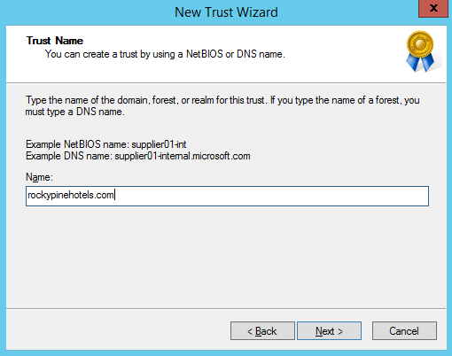 5. On the Trust Name page, enter the name of the forest you want to establish the trust with, click Next.