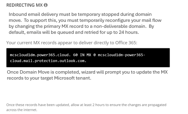 The Domain Move Relay Feature which automatically redirects incoming email to target user mailboxes during domain transfer process will be discontinued after Dec 31, 2025. To facilitate this change, inbound email delivery can be temporarily interrupted to facilitate the domain migration between two M365 tenants. Typically, Internet mail servers will attempt to deliver new email for up to 24 hours. Email queuing can be achieved by changing the primary MX record from the M365 tenant to an unreachable domain.