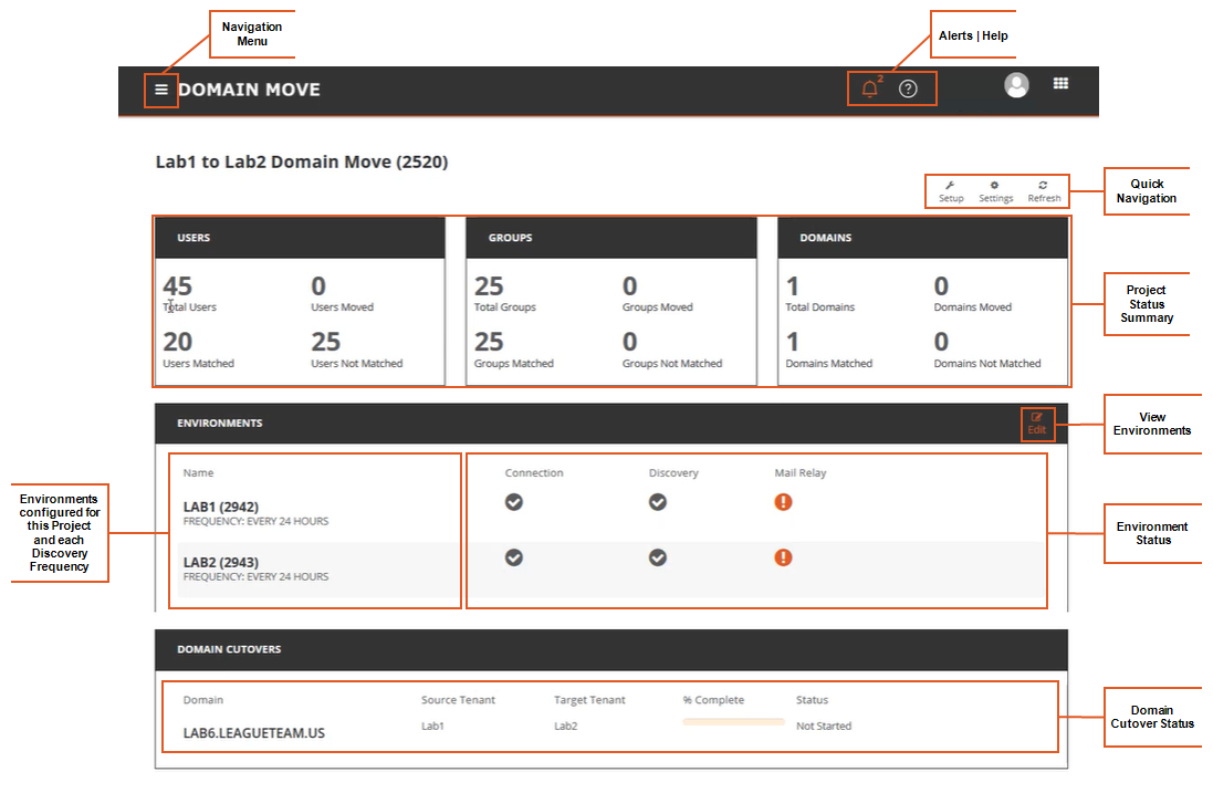 The project dashboard includes overall project status statistics and summary sections covering project status, environments, and Domains ready for Cutover. Quick navigation icons are available at the top of the dashboard to go directly to project setup, settings, and refresh functions. Names and figures can be clicked on to view more detailed information for each item.