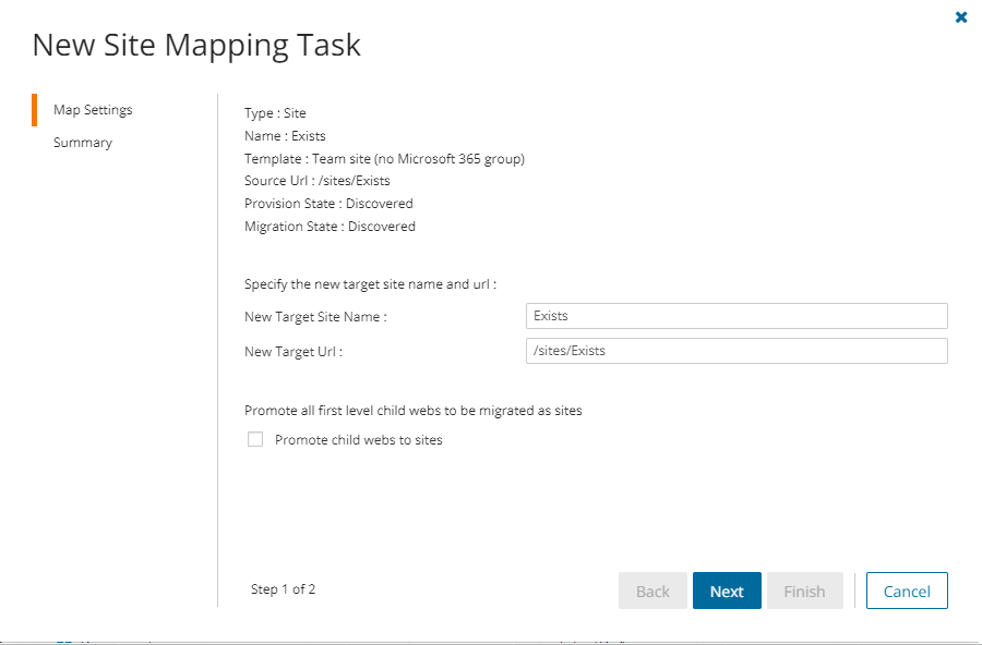 A site cannot be mapped if it was previously migrated in the same project. See the Considerations topic for details about migration behavior if the target site or sub-site that is mapped, already exists before the migration is started.