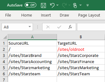 To change the name of a migrated site or relocate the site with a different Url, use a CSV file to set up a custom map. URLs in a mapping file are case sensitive and must be relative URLs. This is a two-step process:
