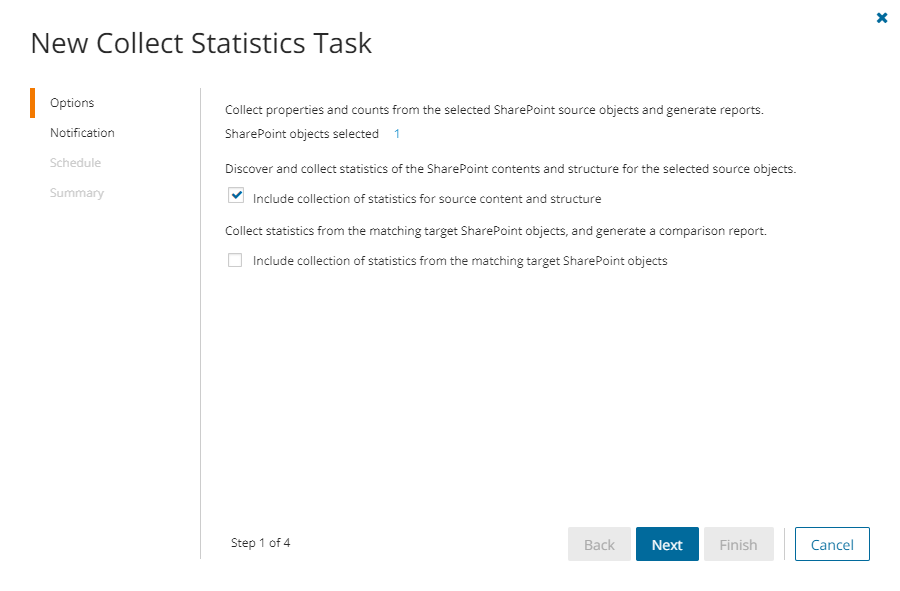 1. Include collection of statistics for source content and structure - select this option to discover and collect statistics of the SharePoint contents and structure for the selected source objects.