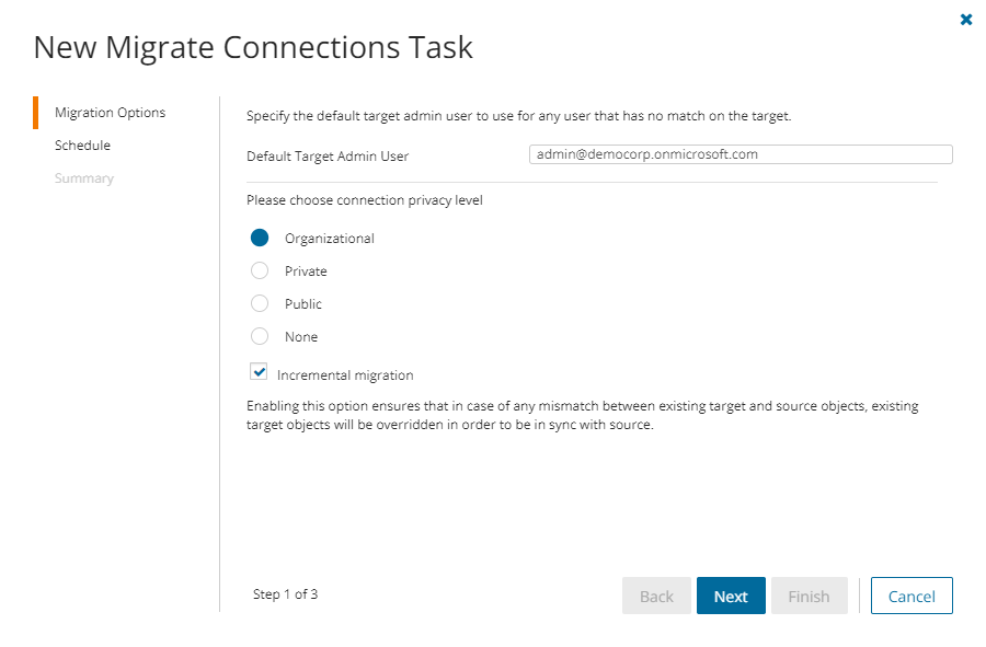 - Incremental migration - select this option to migrate modified or missing data. This option is very helpful in subsequent migrations to keep your migrated data synchronized between source and target tenants.