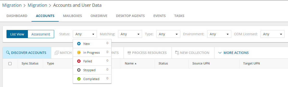 Template Type - You can filter the Templates list view with this filter. To apply a filter, select a value from the filter dropdown that lists the various template types available in the Templates list view. Migration workspaces may have one or more template types that are specific to he workspace. For example, Mail Migration is a template type in the Accounts and User Data migration workspace, and Migrate SharePoint Contents is a template type in the SharePoint migration workspace.