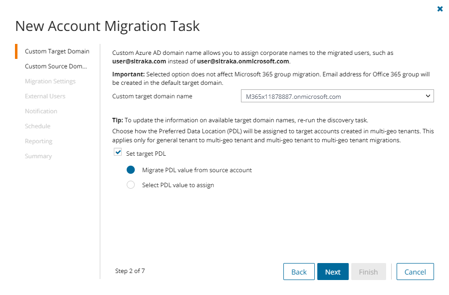 - Set target PDL - choose how the Preferred Data Location (PDL) will be assigned to target accounts created in multi-geo tenants. This applies only for general tenant to multi-geo tenant and multi-geo tenant to multi-geo tenant migrations. The Microsoft 365 multi-geo feature must be available and enabled in the target tenant, otherwise this option is ignored.
