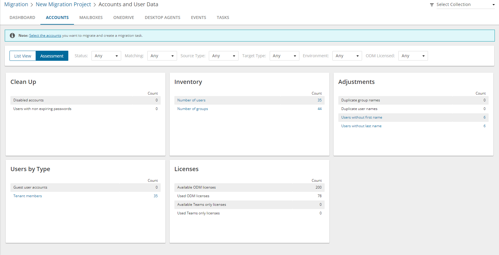 The On Demand Migration account service analyzes your domain structure and tracks potential problems, misconfiguration, and risks that might adversely affect the migration. Switch to Assessment view to see the summary reports about the discovered data.