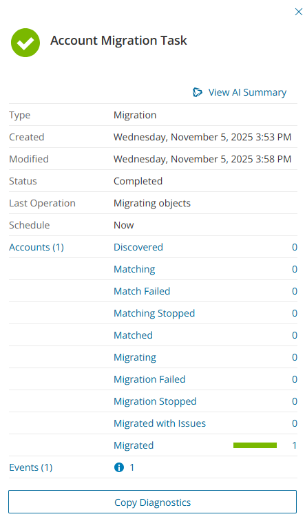 - View AI Summary - This link is available if you opted for the AI feature in the organization you created (see Organizations and Regions), and the task is a migration task that supports the AI migration assistant and you selected the Generate AI summary option in the Reporting step of the migration wizard. Click this link after the task has completed, to view the AI-generated migration summary.