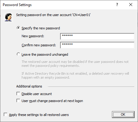Apply these settings to all restored users. Select this check box to apply the specified password settings for all user accounts to be restored from the selected backup.